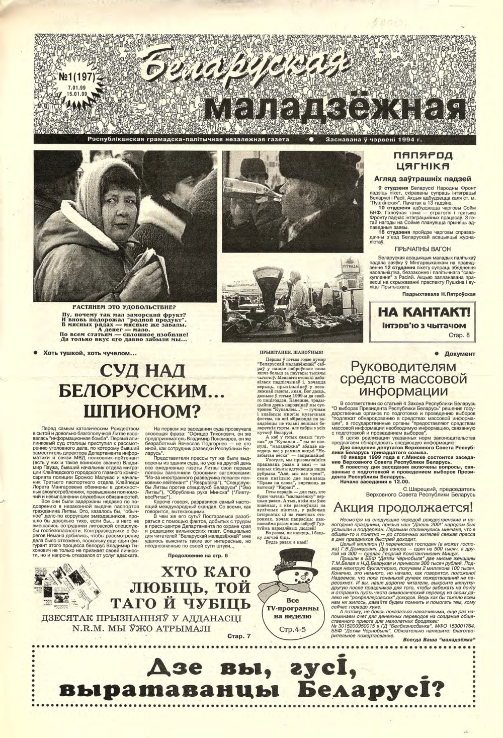 «Беларуская маладзёжная» (1994 - 2002) — беларуская газэта, дадатак да аднайменнай радыёстанцыі. Зарэгістраваная ў сакавіку 1994 году. У ёй друкаваліся расшыфроўкі радыйных гутарак, анонсы этэраў і ўсё, што не зьмяшчалася ў радыёфармат. Калі радыёстанцыю зачынілі, газэта засталася. Галоўны рэдактар — Тацьцяна Мельнічук. Традыцыйны фармат — 8 старонак А3. Газэта асьвятляла нараджэньне й разьвіцьцё палітычнай апазыцыі сярэдзіны-канца 1990-х, дзейнасьць незарэгістраваных моладзевых аб'яднаньняў з усіх бакоў палітычнага сьпектру, сачыла за разьвіцьцём й актуальным станам альтэрнатыўнай моладзевай культуры Беларусі. З 1995 па 1998 рэдакцыя газэты праводзіла у Менску вулічны рок-фэст «Купальле з Беларускай маладзёжнай». Апошні нумар выйшаў у чэрвені 2002 году. У кастрычніку 2003 году пасьведчаньне аб рэгістрацыі было скасаванае міністэрствам інфармацыі РБ. Крыница: be-tarask.wikipedia.org