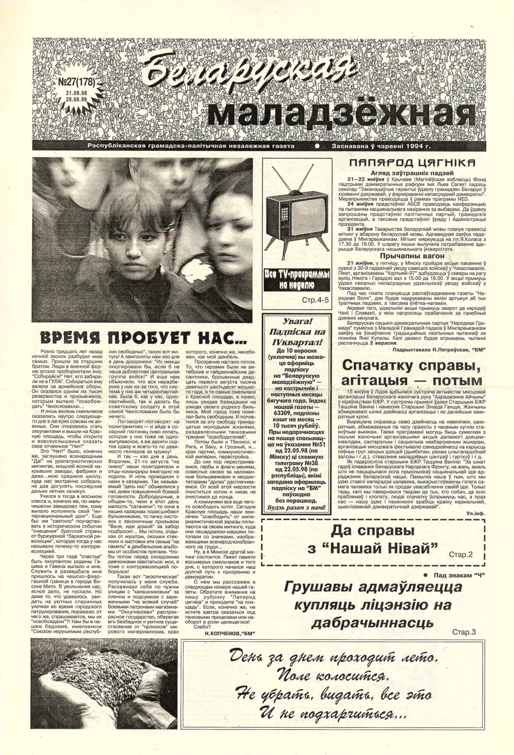 «Беларуская маладзёжная» (1994 - 2002) — беларуская газэта, дадатак да аднайменнай радыёстанцыі. Зарэгістраваная ў сакавіку 1994 году. У ёй друкаваліся расшыфроўкі радыйных гутарак, анонсы этэраў і ўсё, што не зьмяшчалася ў радыёфармат. Калі радыёстанцыю зачынілі, газэта засталася. Галоўны рэдактар — Тацьцяна Мельнічук. Традыцыйны фармат — 8 старонак А3. Газэта асьвятляла нараджэньне й разьвіцьцё палітычнай апазыцыі сярэдзіны-канца 1990-х, дзейнасьць незарэгістраваных моладзевых аб'яднаньняў з усіх бакоў палітычнага сьпектру, сачыла за разьвіцьцём й актуальным станам альтэрнатыўнай моладзевай культуры Беларусі. З 1995 па 1998 рэдакцыя газэты праводзіла у Менску вулічны рок-фэст «Купальле з Беларускай маладзёжнай». Апошні нумар выйшаў у чэрвені 2002 году. У кастрычніку 2003 году пасьведчаньне аб рэгістрацыі было скасаванае міністэрствам інфармацыі РБ. Крыница: be-tarask.wikipedia.org