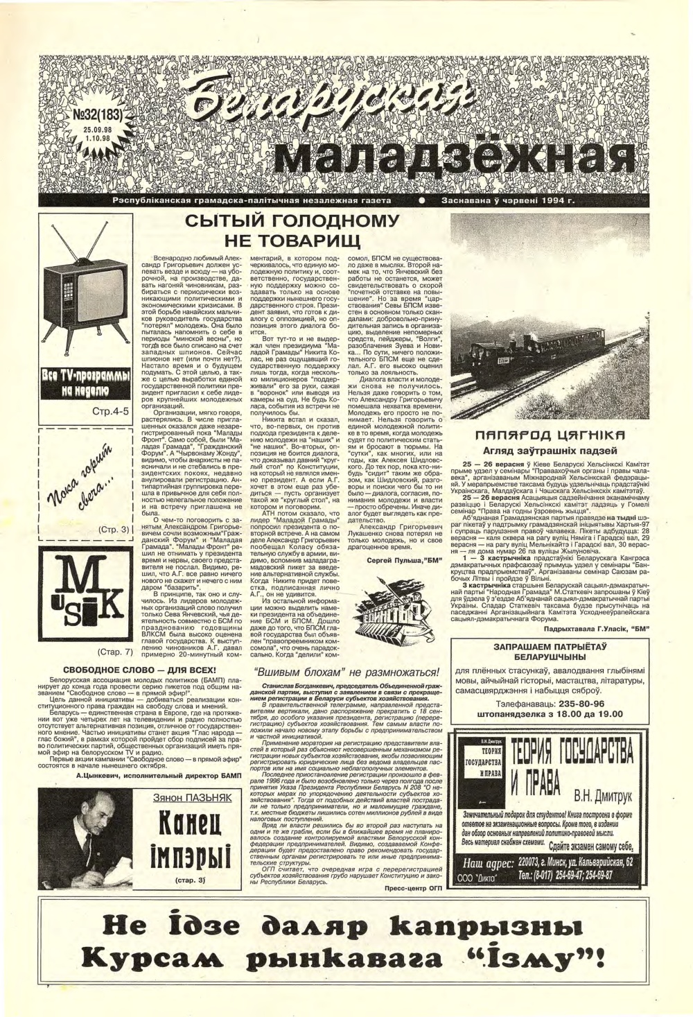 «Беларуская маладзёжная» (1994 - 2002) — беларуская газэта, дадатак да аднайменнай радыёстанцыі. Зарэгістраваная ў сакавіку 1994 году. У ёй друкаваліся расшыфроўкі радыйных гутарак, анонсы этэраў і ўсё, што не зьмяшчалася ў радыёфармат. Калі радыёстанцыю зачынілі, газэта засталася. Галоўны рэдактар — Тацьцяна Мельнічук. Традыцыйны фармат — 8 старонак А3. Газэта асьвятляла нараджэньне й разьвіцьцё палітычнай апазыцыі сярэдзіны-канца 1990-х, дзейнасьць незарэгістраваных моладзевых аб'яднаньняў з усіх бакоў палітычнага сьпектру, сачыла за разьвіцьцём й актуальным станам альтэрнатыўнай моладзевай культуры Беларусі. З 1995 па 1998 рэдакцыя газэты праводзіла у Менску вулічны рок-фэст «Купальле з Беларускай маладзёжнай». Апошні нумар выйшаў у чэрвені 2002 году. У кастрычніку 2003 году пасьведчаньне аб рэгістрацыі было скасаванае міністэрствам інфармацыі РБ. Крыница: be-tarask.wikipedia.org