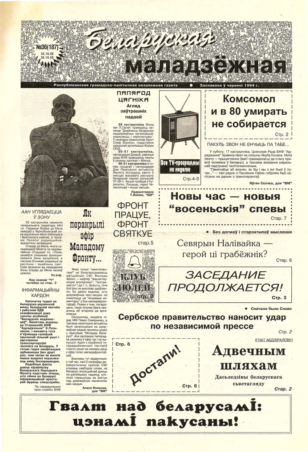 «Беларуская маладзёжная» (1994 - 2002) — беларуская газэта, дадатак да аднайменнай радыёстанцыі. Зарэгістраваная ў сакавіку 1994 году. У ёй друкаваліся расшыфроўкі радыйных гутарак, анонсы этэраў і ўсё, што не зьмяшчалася ў радыёфармат. Калі радыёстанцыю зачынілі, газэта засталася. Галоўны рэдактар — Тацьцяна Мельнічук. Традыцыйны фармат — 8 старонак А3. Газэта асьвятляла нараджэньне й разьвіцьцё палітычнай апазыцыі сярэдзіны-канца 1990-х, дзейнасьць незарэгістраваных моладзевых аб'яднаньняў з усіх бакоў палітычнага сьпектру, сачыла за разьвіцьцём й актуальным станам альтэрнатыўнай моладзевай культуры Беларусі. З 1995 па 1998 рэдакцыя газэты праводзіла у Менску вулічны рок-фэст «Купальле з Беларускай маладзёжнай». Апошні нумар выйшаў у чэрвені 2002 году. У кастрычніку 2003 году пасьведчаньне аб рэгістрацыі было скасаванае міністэрствам інфармацыі РБ. Крыница: be-tarask.wikipedia.org