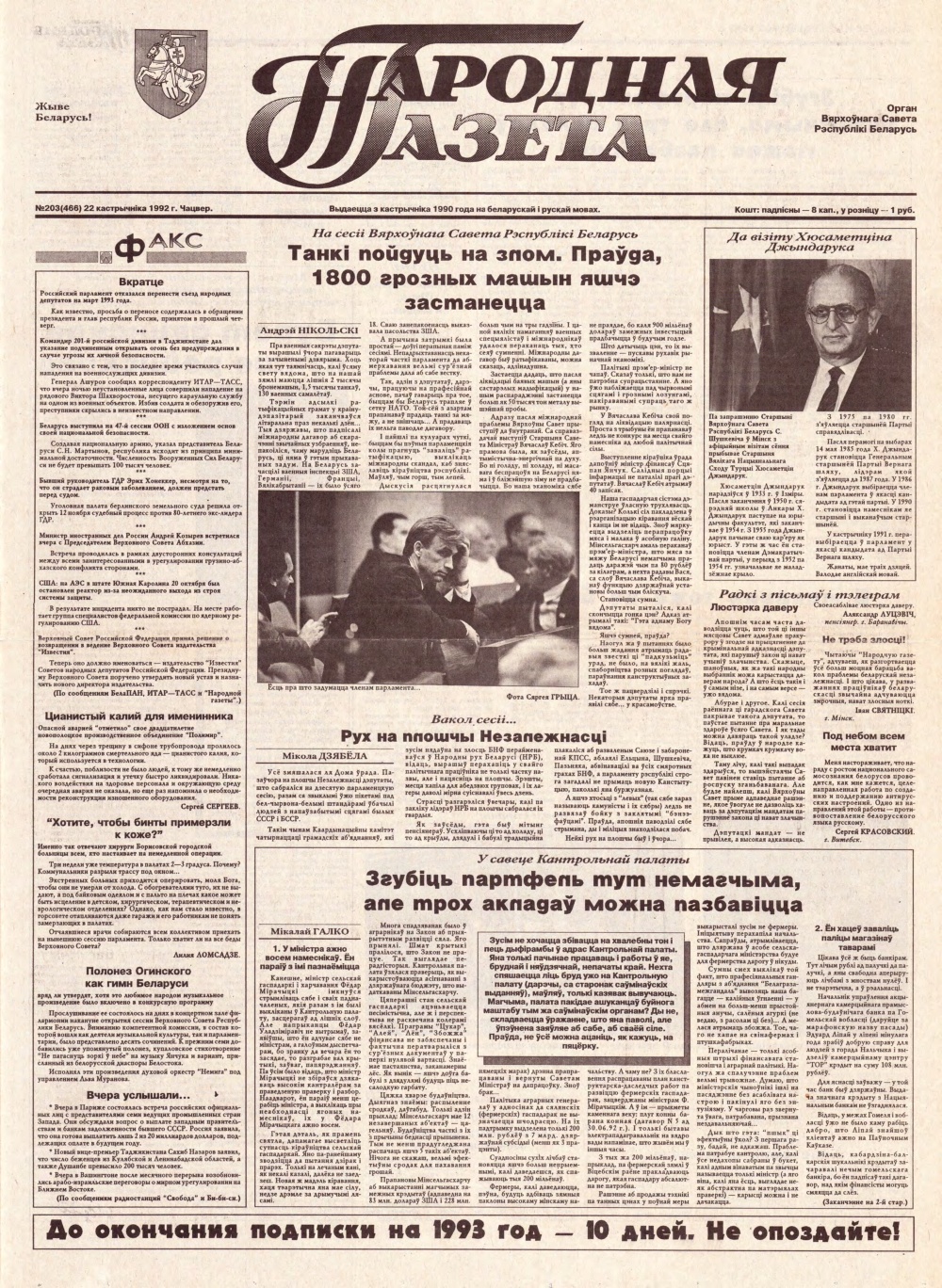 «Народная газета» — орган Вярхоўнага Савета Рэспублікі Беларусь. Выдавец: Адкрытае акцыянернае таварыства Народная газета. Выходзіць штодзённа, акрамя нядзелі і панядзелка, 250 разоў у год. Выдаецца з кастрычніка 1990 года на беларускай і рускай мовах. З 1990 па 1995 год пасаду галоўнага рэдактара «Народнай газеты» займаў Іосіф Сярэдзіч. З мая 1990 па студзень 1996 — дэпутат Вярхоўнага Савета XII склікання. Выданне займала ўмераную цэнтрысцкую пазыцыю, імкнучыся адлюстраваць палітычныя погляды большасці грамадзян. 17 сакавіка 1995 г. Указам № 113 Аляксандр Лукашэнка прызначыў галоўным рэдактарам «Народнай газеты» Мікалая Галко, не зважаючы на тое, што правам прызначаць галоўнага рэдактара сваёй уласнай газеты валодаў толькі Вярхоўны савет.