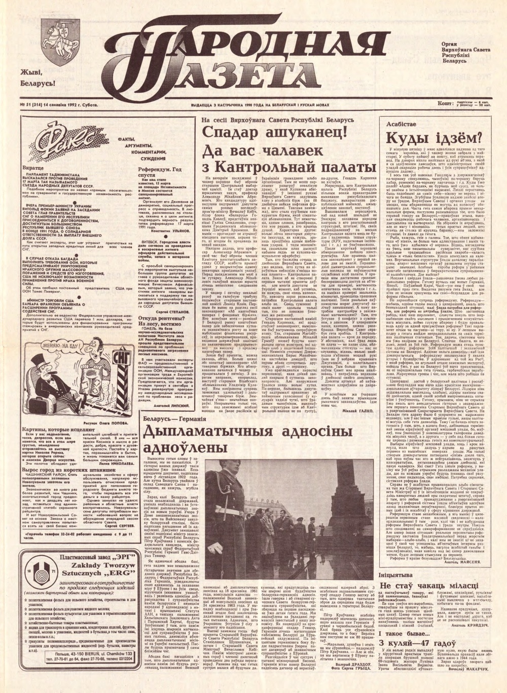 «Народная газета» — орган Вярхоўнага Савета Рэспублікі Беларусь. Выдавец: Адкрытае акцыянернае таварыства Народная газета. Выходзіць штодзённа, акрамя нядзелі і панядзелка, 250 разоў у год. Выдаецца з кастрычніка 1990 года на беларускай і рускай мовах. З 1990 па 1995 год пасаду галоўнага рэдактара «Народнай газеты» займаў Іосіф Сярэдзіч. З мая 1990 па студзень 1996 — дэпутат Вярхоўнага Савета XII склікання. Выданне займала ўмераную цэнтрысцкую пазыцыю, імкнучыся адлюстраваць палітычныя погляды большасці грамадзян. 17 сакавіка 1995 г. Указам № 113 Аляксандр Лукашэнка прызначыў галоўным рэдактарам «Народнай газеты» Мікалая Галко, не зважаючы на тое, што правам прызначаць галоўнага рэдактара сваёй уласнай газеты валодаў толькі Вярхоўны савет.