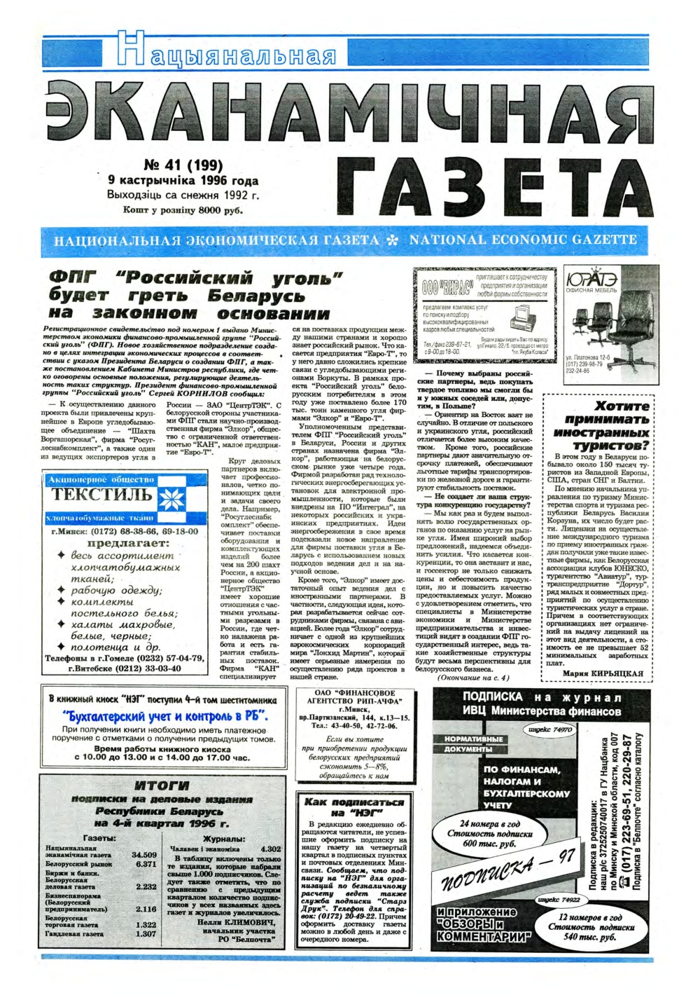 «Нацыянальная эканамічная газета» — «Нацыянальная эканамічная газета» — заснаваная часопісам «Чалавек і эканоміка». Найстарэйшае эканамічнае выданне ў Рэспубліцы Беларусь. Выходзіць са снежня 1992 года. Газета адной з першых узялася за эканамічную адукацыю, выхаванне спецыялістаў новай фармацыі ў перыяд пераходу ад адміністрацыйна-каманднай сістэмы гаспадарання да рынку. Праблемы макраэканомікі і фінансаў, бухгалтарскага ўліку і падаткаабкладання, гаспадарчага і працоўнага права і знешнеэканамічнай дзейнасці, цэнаўтварэння і статыстыкі, аўдыту і кансалтынгу - усё гэта знаходзіць сваё адлюстраванне ў газеце. З 1998 года выходзіць пад назвай «Нацинальная экономическая газета».