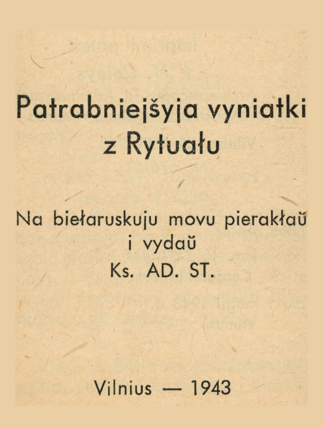 Гэтая кніга належыць да бібліятэкі сучаснага Віленскага Беларускага Музэю імя Івана Луцкевіча. Адсканавана ў рамках праекту Баркулаб. Патрабнейшыя выняткі з рытуалу / Пэраклаў і выдаў кс. Адам Станкевіч, кніжны цэнзар В. Ташкунас. Вільнюс: [s.n.] 1943. — 32 с. Памеры аркуша: 11,5 х 7 см. Стан прымальны: плямы іржы ад скобак. Паходжаньне ў зборы невядомае.