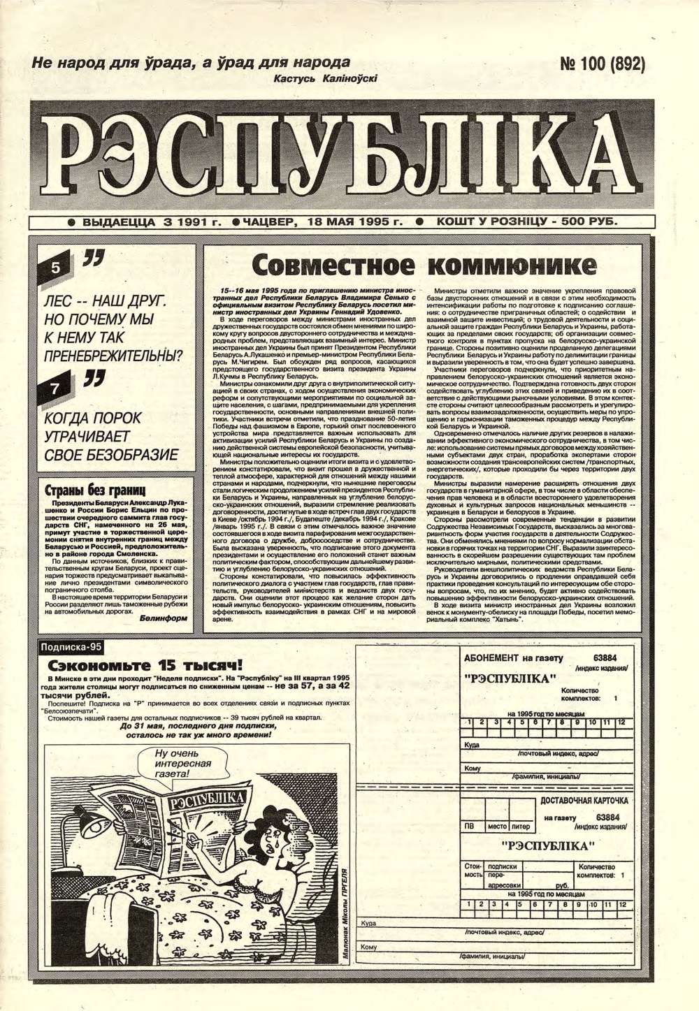 «Рэспубліка» — газета для тых, хто самастойна прымае рашэнні. Заснавальнік - Савет Міністраў Рэспублікі Беларусь. Выдаецца з чэрвеня 1991. Газета выходзіць 250 разоў у год. Аўтары апублікаваных матэрыялаў нясуць адказнасць за падбор і дакладнасць фактаў, іх меркаванні неабавязкова адлюстроўваюць пункт гледжання рэдакцыі. Рукапісы, фотаздымкі і малюнкі не рэцэнзуюцца і не вяртаюцца.