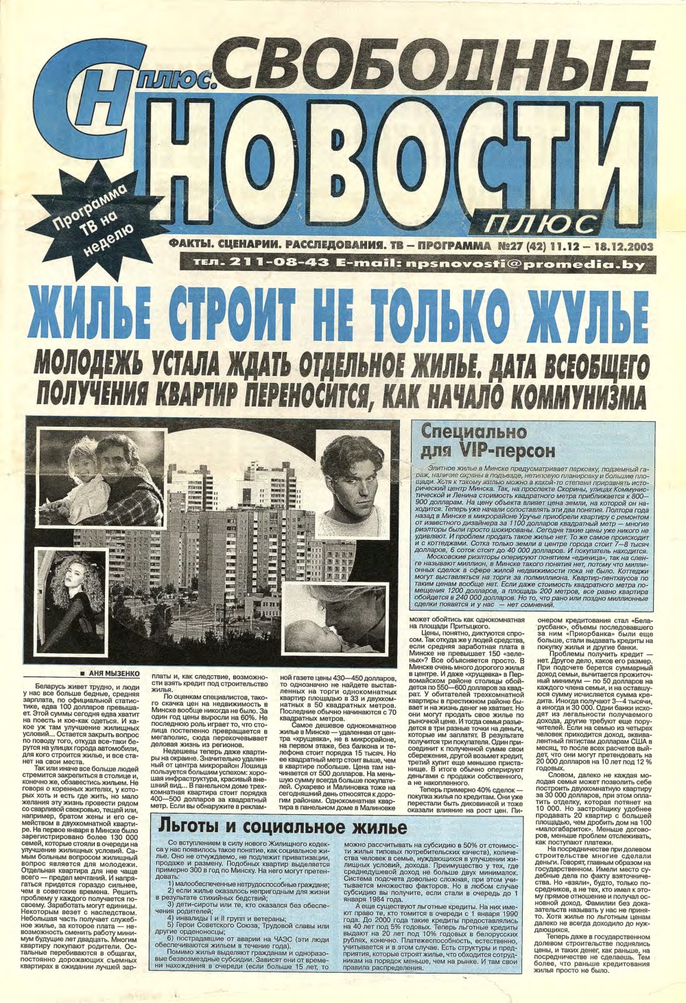 «Свободные новости плюс» — информационно-аналитический еженедельник. Издается с сентября 2002 года. Учредители: Белорусская научно-промышленная ассоциация и промышленно-коммерческая компания «Белфакс». За текст рекламы несет ответственность рекламодатель.