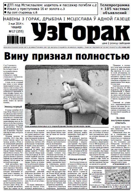 Абласная газета "УзГорак" выходзіць у Горацкім, Дрыбінскім і Мсціслаўскім раёнах па чацвяргах. Наклад - 1500 асобнікаў на тыдзень. Незалежныя навіны і каментарыі, тэлепраграма, прыватныя аб'явы, астрапрагноз і віншаванні.