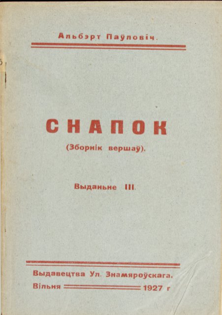 Гэтая кніга належыць да бібліятэкі сучаснага Віленскага Беларускага Музэю імя Івана Луцкевіча. Адсканавана ў рамках праекту Баркулаб. Паўловіч, Альбэрт. Снапок (зборнік вершаў). / 3-е выданьне. Вільня: Выдавецтва Ул. Знамяроўскага, 1929 (на вокладцы памылкова адзначана 1927). - 40 стр. Памеры аркуша: 18 х 12,7 см. Стан добры: кніга на ржавых металёвых скобах. На першай старончы пячатка: "Bibloteka Vucz. J. Tulejka №105", на каренчыку падклеены нумар "105". Са збору Янкі Тулейкі.