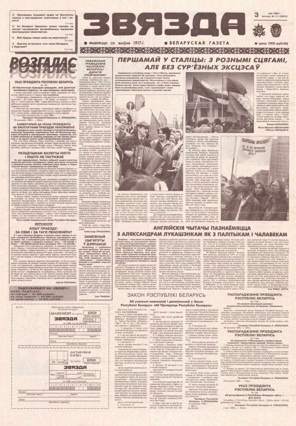 «Звязда» — орган Цэнтральнага Камітэта Камуністычнай партыі Беларусі, Вярхоўнага Савета і Савета Міністраў Беларускай ССР. Выходзіць 250 разоў на год. Аўтары апублікаваных матэрыялаў нясуць адказнасць за падбор і дакладнасць фактаў. Іх меркаванні неабавязкова адлюстроўваюць пункт гледжання рэдакцыі.